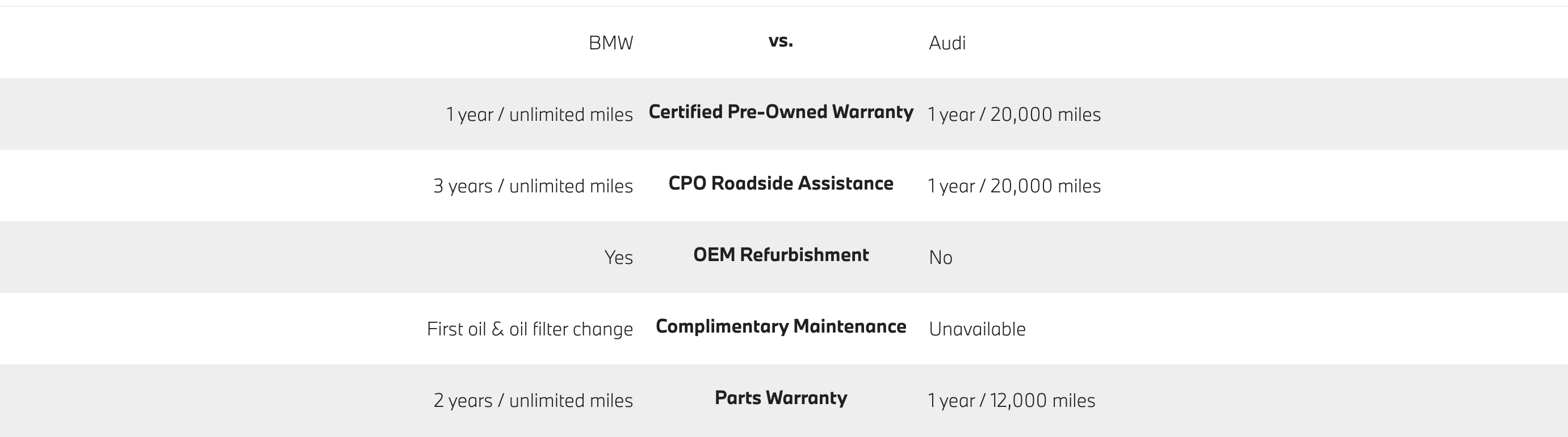 Another major difference between BMW and Audi warranty coverage lies in each automaker's certified pre-owned (CPO) program. While each brand has similar requirements for a used vehicle to earn the "certified" title, BMW takes warranty coverage a step further by upping mileage limits, extending roadside assistance coverage, and providing a complimentary maintenance visit. Compare the BMW vs. Audi CPO programs below for all the details: