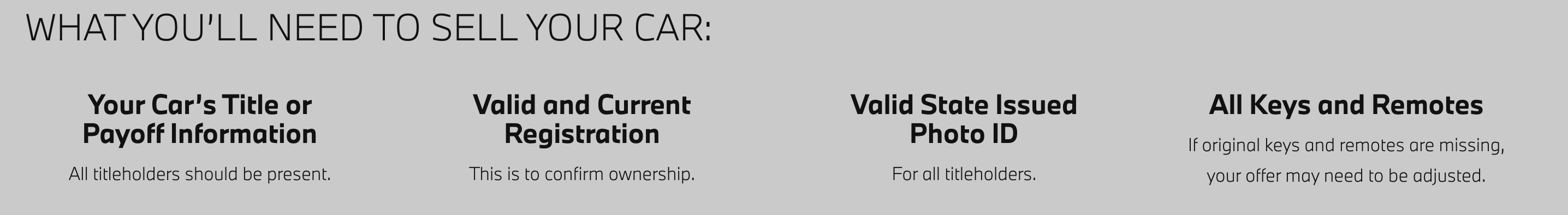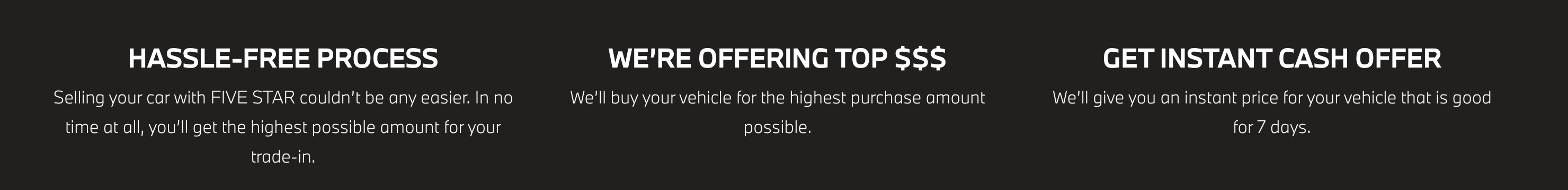 Tell us about your car’s specific features and conditions. Then find out what you can get for your car right away! Offers are good for 7 days.